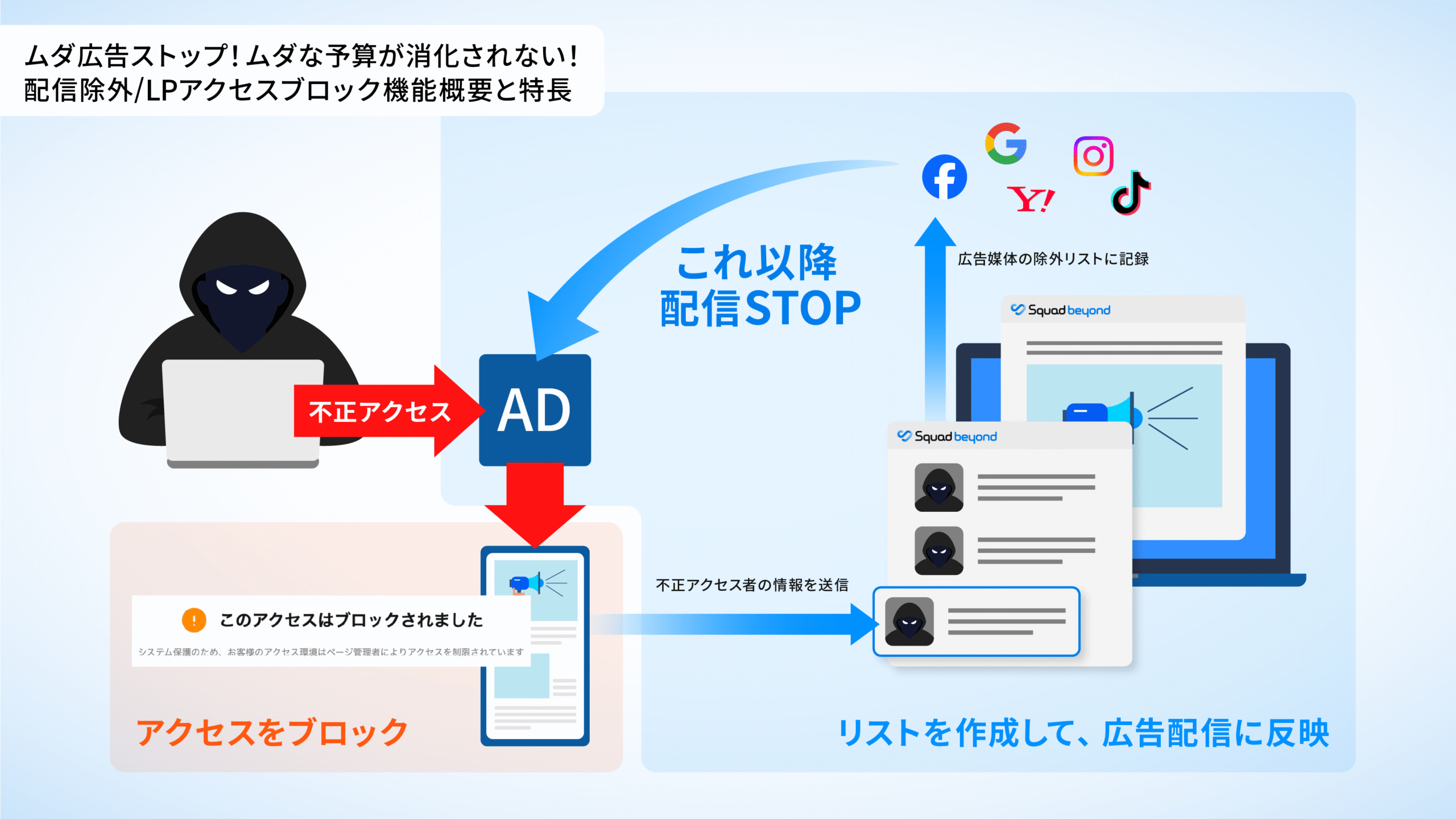 - 不正なアクセスをSquadbeyondのLpで検知し、リスト化。広告配信を停止します。